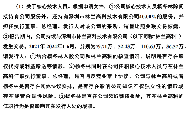 公司与核心技术人员的关联交易也浮出水面。核心技术人员杨冬林及其配偶控制的林兰高科是公司关联方。