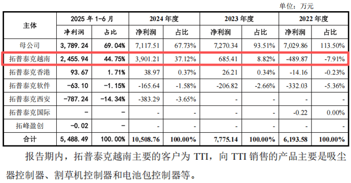 其三,越南子公司上演“扭亏魔术”。拓普泰克越南在2021、2022年连续亏损后,2023年突然盈利685.41万元,2024年更实现净利润3901.21万元。而越南子公司超过70%的收入销往越南,其中大部分最终客户是TTI。这一地域与客户的叠加,使其业绩的真实性与独立性受到拷问。